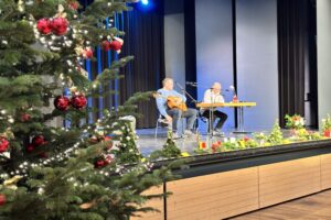 Ein festlich geschmückter Christbaum, weihnachtlicher Tischschmuck und die am Bühnenrand von unserer kreativen Bastlergruppe angefertigten weihnachtlichen Gestecke aus Naturmaterialien geschmückt mit bunten Weihnachtskugeln, Schleifchen, Sternen und Weihnachtsketten am Bühnenrand verliehen dem großen Bürgersaal zur Post eine vorweihnachtliche Stimmung. Liebevoll dekorierter Tischschmuck mit frischem Tannengrün, Mandarinen und weihnachtlichem Gebäck, Hasel- und Erdnüssen…