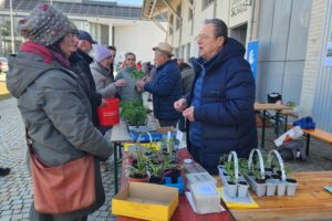 Natürlich waren die Gartenfreunde mit Klaus Steckert und Toni Hötzinger dieses Jahr wieder auf der Pflanzenbörse am VHS Stadl vertreten mit zahlreichen selber gezüchteten Gewächsen. Eines der Fachgebiete: Tomaten – und das brachte Toni großen Andrang und den Spitznamen „Tomatenmann“ ein.