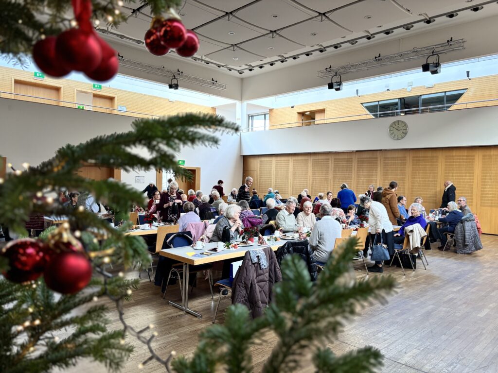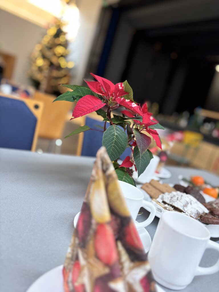 Liebevoll dekorierter Tischschmuck mit frischem Tannengrün, Mandarinen und weihnachtlichem Gebäck, Hasel- und Erdnüssen verzierte die Tische. 115 Mitglieder, Eigenheimer, Freunde und auch Gäste waren willkommen zur vorweihnachtlichen Einstimmung. Reiner Vollmer spendierte außerdem kleine Weihnachtssterne für die Tischdekoration, die große Begeisterung fanden.