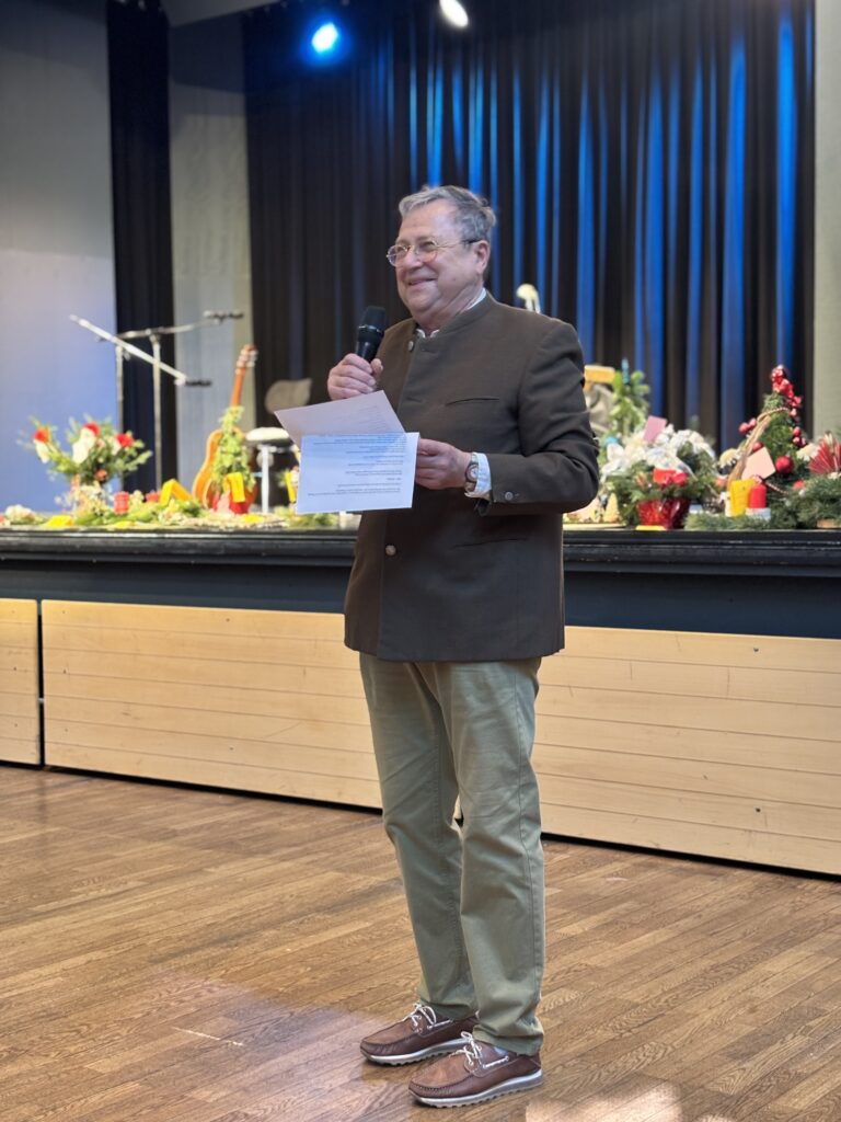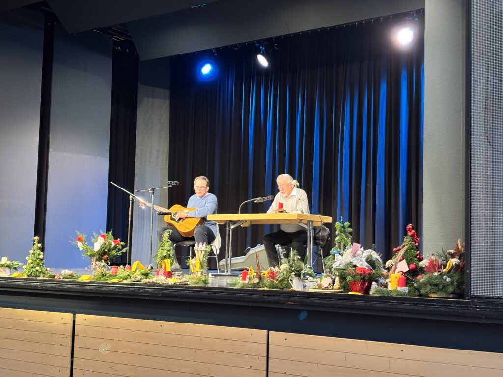 Dann wurde es leise im Saal, als Anton Hötzinger seine heiteren, hintergründigen und immer wieder nachdenklichen Weihnachtsgeschichten und Gedichte vorlas. Begleitet wurde er mit vorweihnachtlichen Weisen von Franz Beer an der Gitarre.