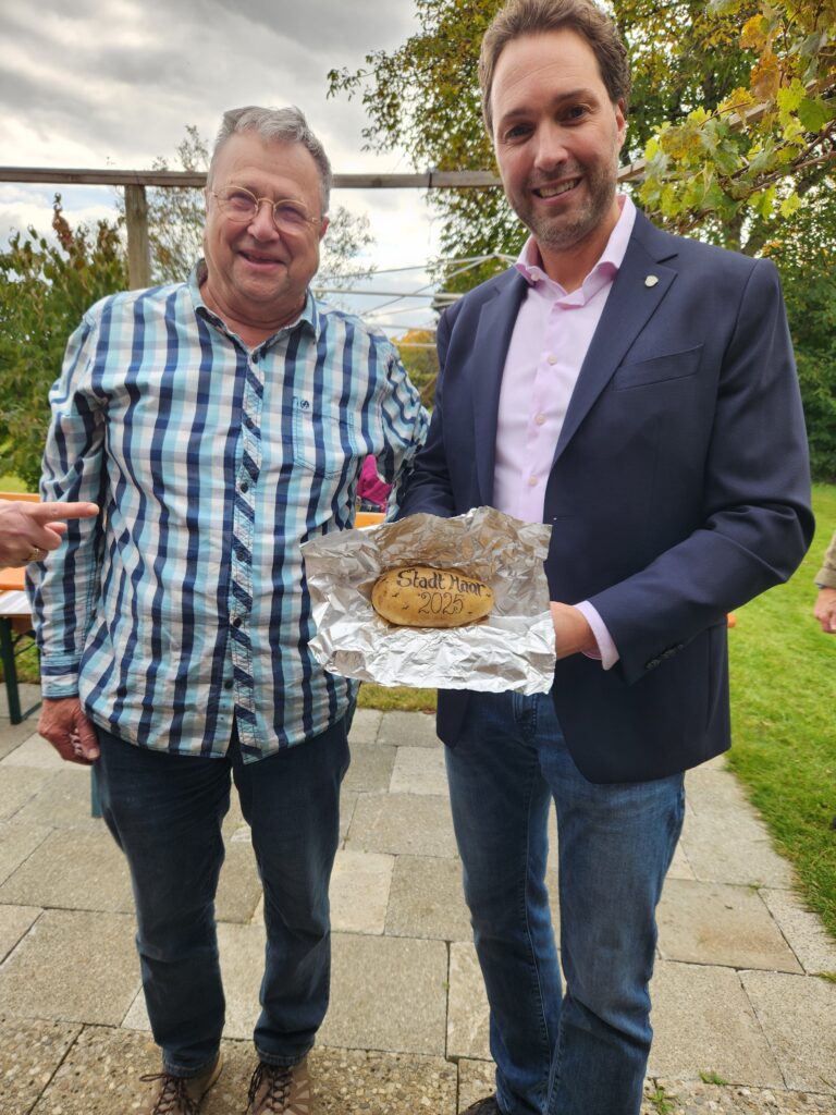 Klaus Steckert, 1. Vorsitzender der Gartenfreunde Haar überreichte dem 1. Bürgermeister eine von Yogesh Rao wunderschön bemalte Haarer Stadtkartoffel, eine Spende vom Habeker Hof Haar, so wie auch alle anderen Kartoffeln. Hierfür ein herzliches Dankeschön an die Familie Habeker.